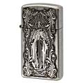 通常のエッチング(腐食加工)は、デザインを凹ませて表現するのに対し、デザインを凸に浮き上がらせる逆エッチングを施したスペシャルなZippo。彫刻加工のような繊細、かつ重厚さを漂わせる深彫り。表、裏それぞれ異なるデザインに銀いぶし仕上げ。アクセ感覚のカッコよさと重厚さが同居する逸品です。