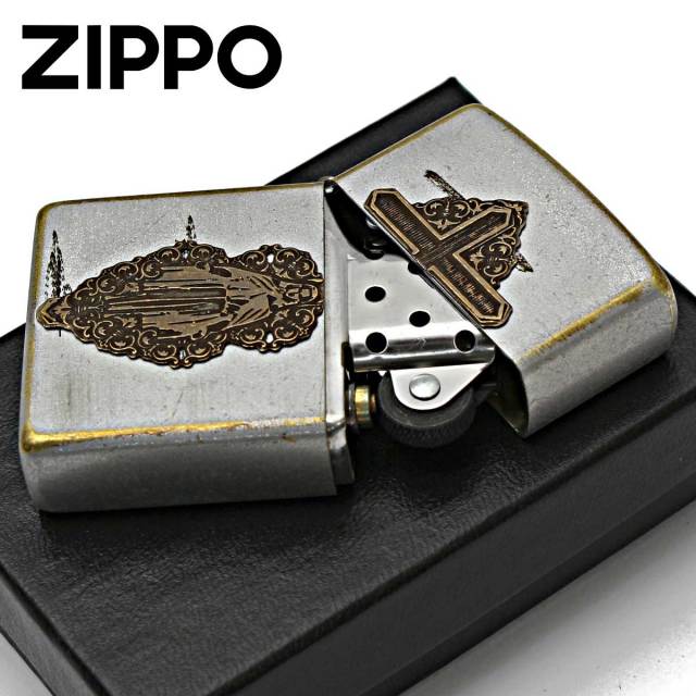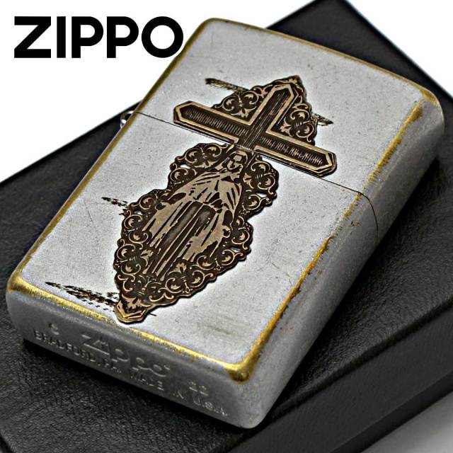 十字架を背にしたマリアのメタル貼りのZIPPOです。1つ1つ、手でブラッシュ加工をして長年使い込んだような風合いの仕上がり。お守り代わりに持ち歩くのもGOOD♪
