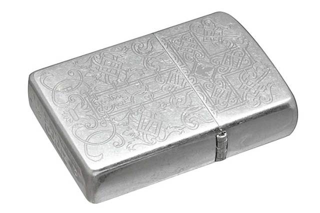 クロスアラベスク柄を銀盛り上げ加工で両面にデザインしたZippoです。