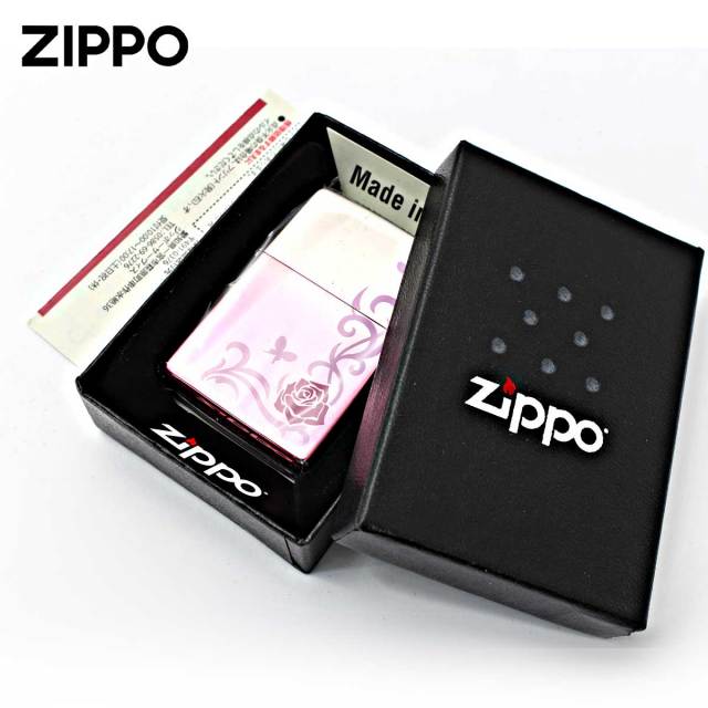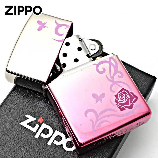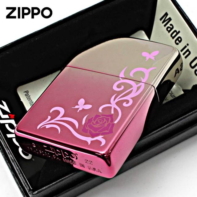 ピンクのグラデーションコーティングが、目を引くバラと蝶々のデザイン。女性が好む、バラと蝶々のデザインが可愛らしいZippoです。女性へのプレゼントにオススメ!