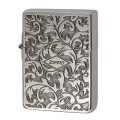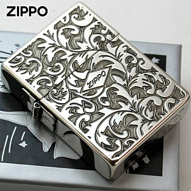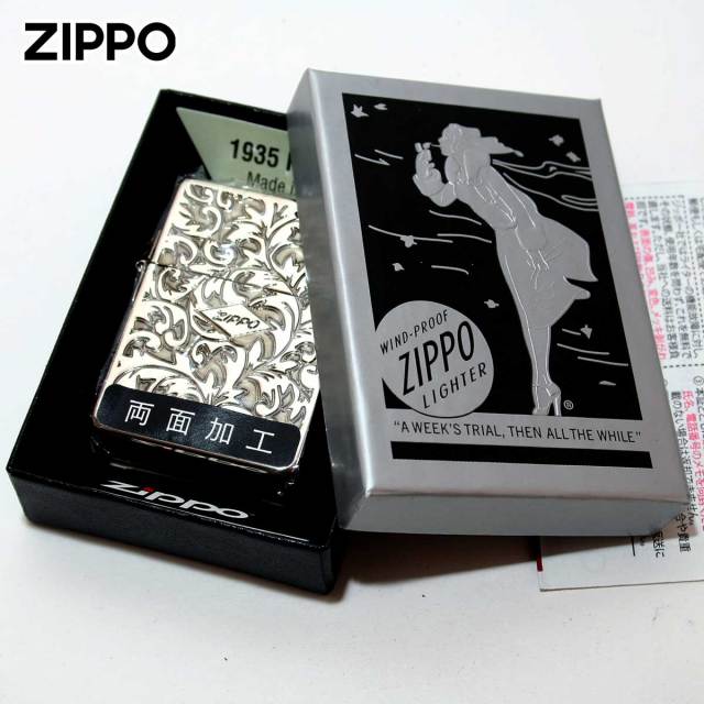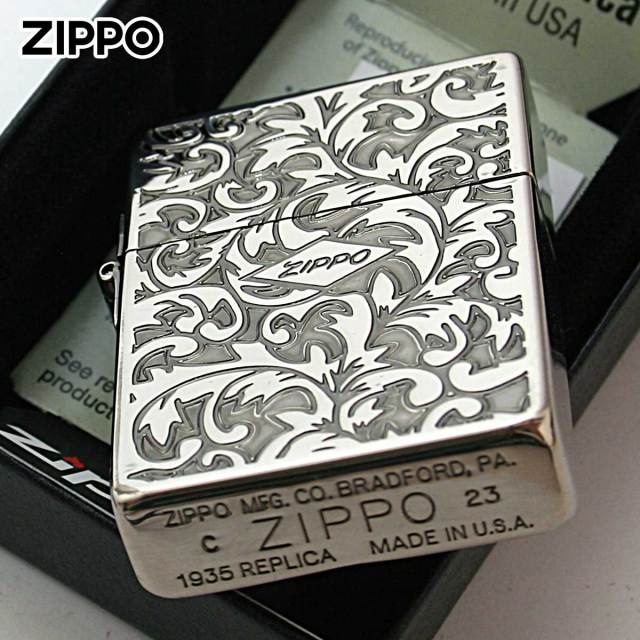 1935レプリカがベース、当時の形状の特徴であるブラス材を輪切りにしたようなスクエアケースに、専用のインサイドユニット、ダミーではない本物の3バレル外ヒンジ、フリントホイール部の中空リベット。両面にアラベスク柄を加工、表面の中央にZIPPOロゴが配されております。アラベスク模様とは、アラビア風の植物文様のことで一般的には「ヨーロッパ調の唐草模様」を指します。アラベスク模様は、緻密でクラシカルな雰囲気です。いぶし仕上げを施したことで、アンティーク感も感じられます。年上の方への贈り物に最適です。