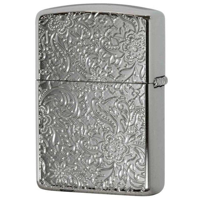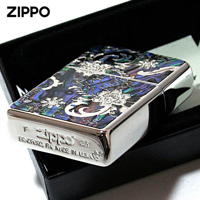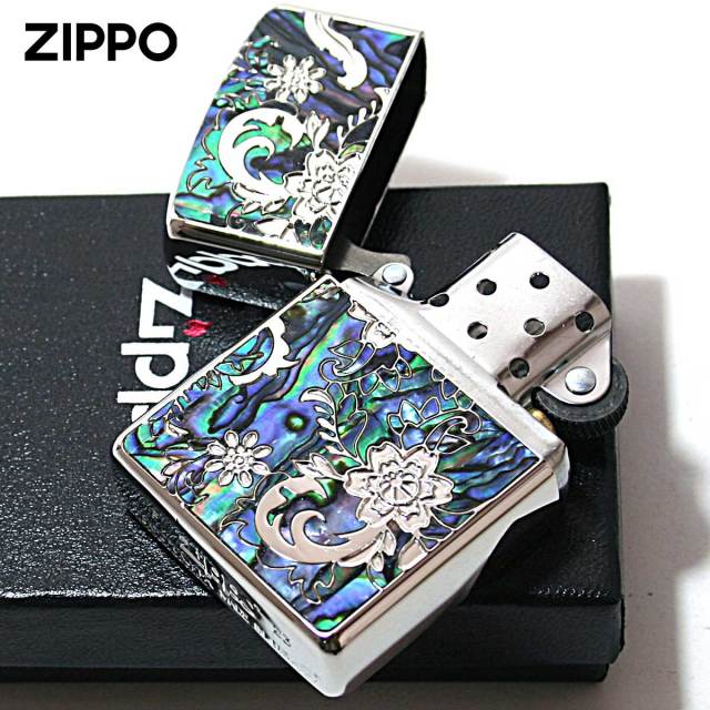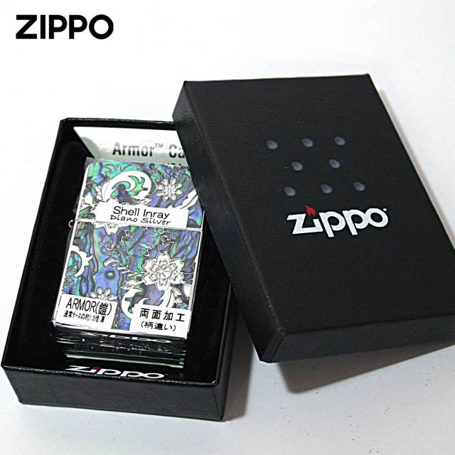 花柄をメインにアラベスク調に葉っぱをアレンジしたデザインが綺麗です。シェルを水に見立て花が浮かんでいるかの様な、アートな逸品!表面とは一転、裏面はシンプルに彫刻のみで表現。アーマーケース・両面加工・貝貼りと贅沢な高級感溢れるZIPPOです。プレゼントに最適!
