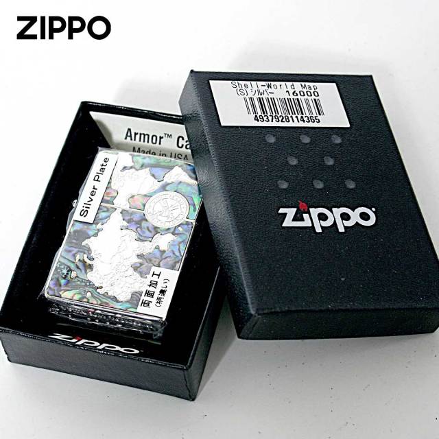 シェルを海に見立てて世界地図を再現したZippo。シェル独特の模様が、海の雄大さを演出します。裏面には、大海原を進む帆船をエッチング加工で細部までこだわってデザイン。世界一周を夢見るあなたに・・・