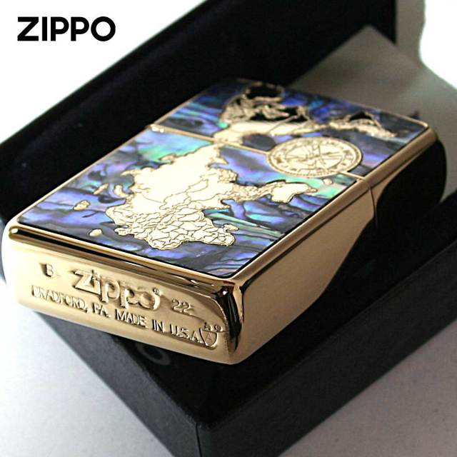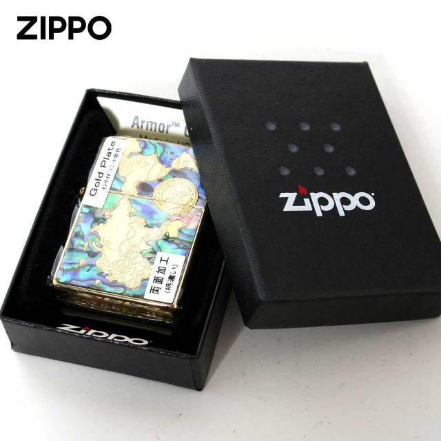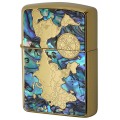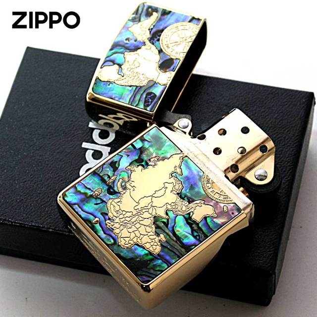 シェルを海に見立てて世界地図を再現したZippo。シェル独特の模様が、海の雄大さを演出します。裏面には、大海原を進む帆船をエッチング加工で細部までこだわってデザイン。世界一周を夢見るあなたに・・・