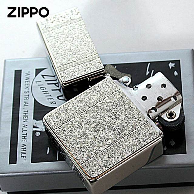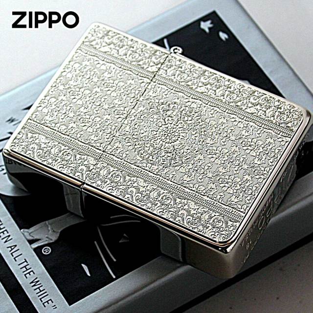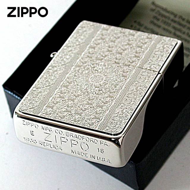 ダマスク柄のメタルプレートを1935レプリカZippoに貼り付けました。ダマスク柄とは、紋織物の一種であるダマスク織の模様をモチーフにした柄の事です。上品で優雅な雰囲気のダマスク柄は、ファッションや食器などあらゆる商品に用いられます。細かい彫刻は、芸術的で目を奪われます。女性にオススメ!