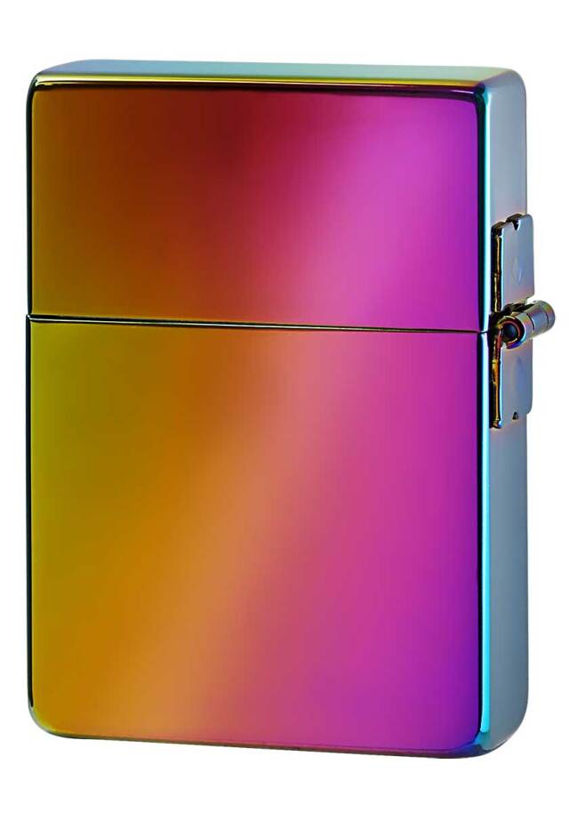 1935年当時のZIPPOライターの特徴であるスクエア型・専用インサイドユニット・3バレル外ヒンジ・フリントホイール部中空リベットなどを忠実に再現した1935レプリカ。蒸着メッキと呼ばれる特殊な表面加工を施して虹色の輝きを表現したZIPPOです。もちろん鏡面仕上げだからキラキラと虹色に輝く様はとってもビューティフル!