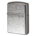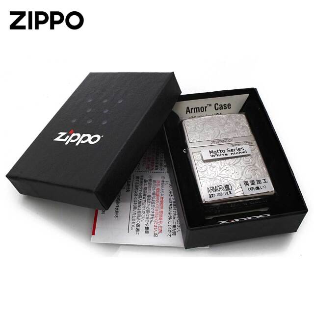 レギュラーケースの1.5倍の厚さアーマーケースがベース。表面は、アラベスク柄のメタルプレートが貼り付けられております。裏面には、エッチングでストライプを彫刻。シンプルで落ち着いた面持ちのZIPPOです。女性が持つと美しいデザイン!