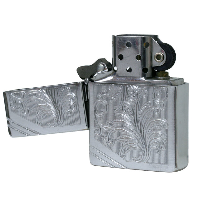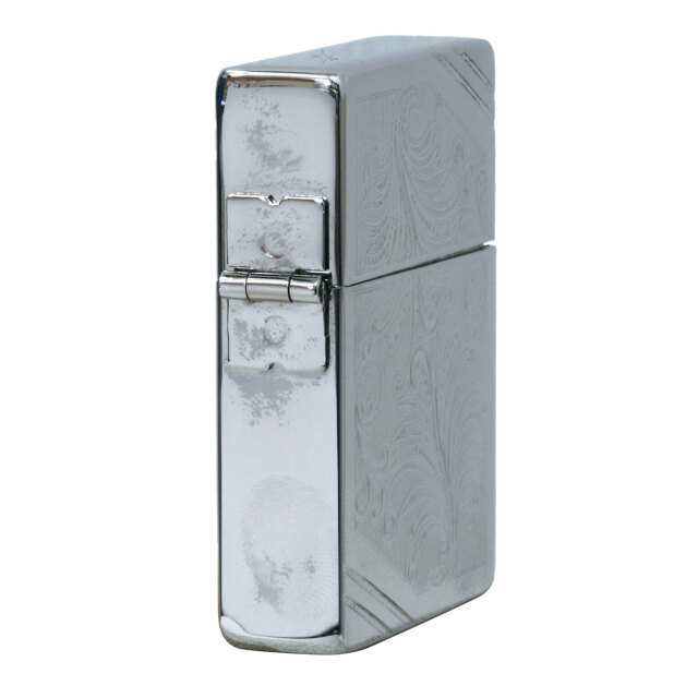 ZIPPO定番のベネチアン彫刻デザイン。外ヒンジ、3バレル、専用インサイドユニット。ハンドバフ仕上げの滑らかな手触り。当時の形状の特徴であるブラス材を輪切りにしたようなスクエアケースに、専用のインサイドユニット、ダミーではない本物の3バレル外ヒンジ、フリントホイール部の中空リベット。機能を損ねることなく1935年当時のZIPPOを忠実に復刻。