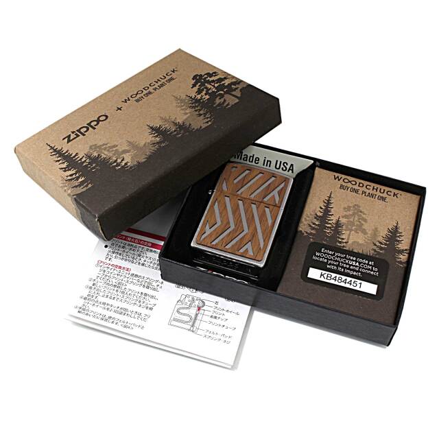 ZIPPO社とWOODCHUCK USAの「Buy One」との提携で実現した「BUY ONE. PLANT ONE.」プログラム。両面ウッド貼りの温かみのあるZIPPO。幾何学模様もスタイリッシュでかっこよさを演出かっこよさを演出しています。また、ZIPPO毎に番号が付随し自分の木が植えられた場所を知ることが出来ます。ヘリンボーンスイープ、両面ウッド貼り付け。