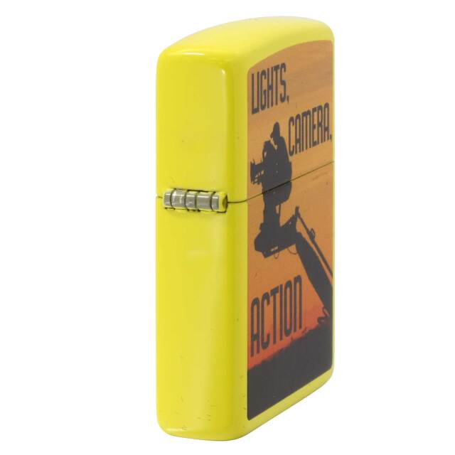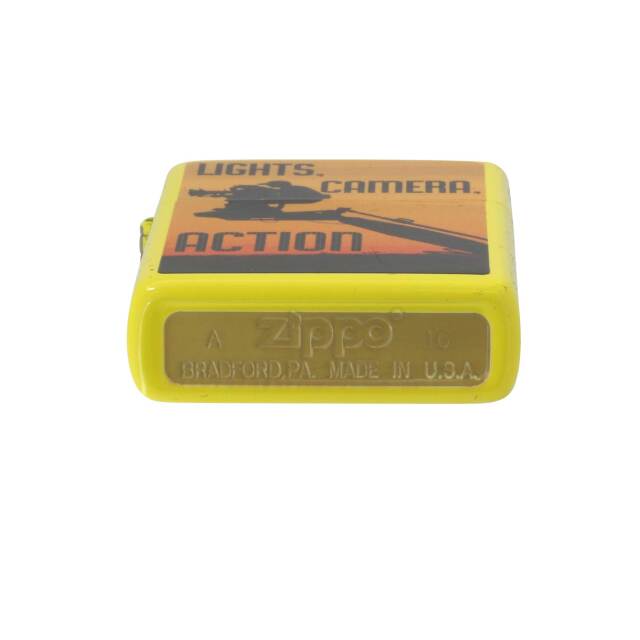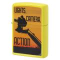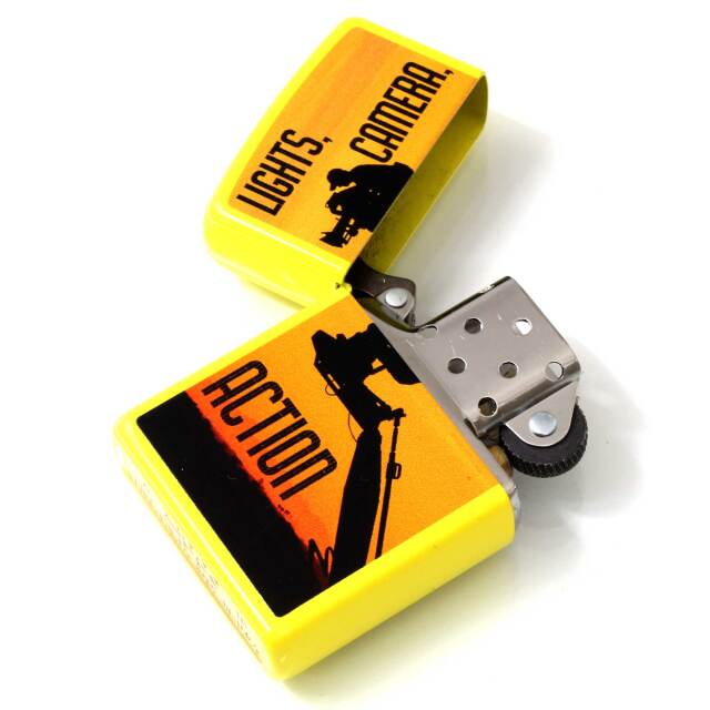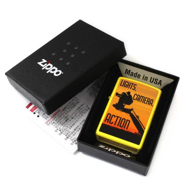 LIGHTS, CAMERA, ACTIONのデザインZIPPO。直訳すれば「ライトよし、カメラよし、はいアクション!」。3・2・1、GO!みたいな感じ。夕焼けの背景にカメラマンのシルエットも素敵です。ベースの鮮やかなイエローも相まって明るく楽しくなるようなデザインです。マットイエロー、プリント。