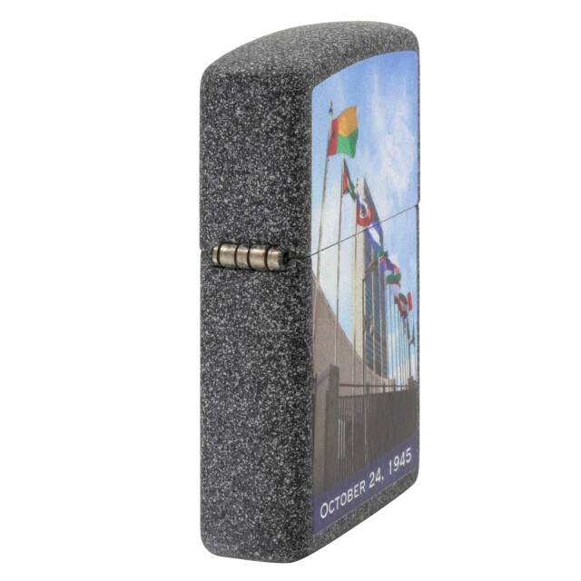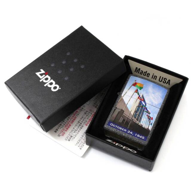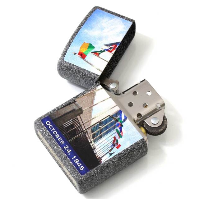 1945年10月24日、国連の設立記念日のデザインZIPPO。表面には、国連の本部が大きくプリントされています。アイロンストーン、プリント。