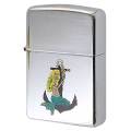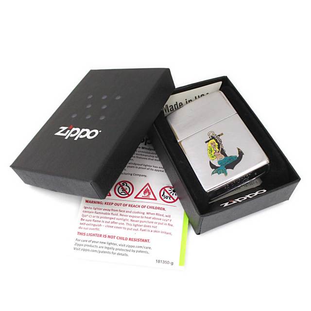 人魚が碇に寄り添う、よく見ると少しシュールな絵柄がデザインされております。クロムメッキ、エッチング、色入れ。買取後に、ジッポリペアへ修理をだしております。そのため、インサイドユニットは新品です。