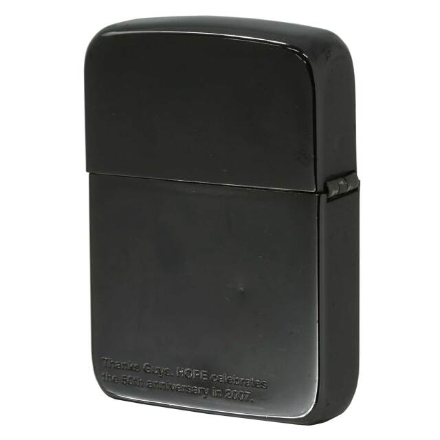 JT(日本たばこ産業株式会社)の「HOPE」タバコの銘柄の非売品Zippoです。通常のボトムマークとは違い、製造年のところが「A HP」となっています。ブラッシュドクロームの1941レプリカに全面にロゴと弓矢がデザインされています。ブラックグロス加工。