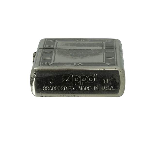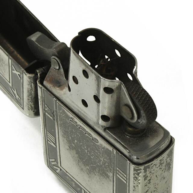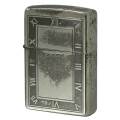 スクエア型の時計の文字盤のようなデザインのZIPPO。ローマ数字は逆エッチングで立体的に浮き出ています。枠やZippoロゴマークはエッチング。元々はブラックニッケル加工でしたが、経年劣化によりまだらになり、燻加工のようなアンティーク調に。