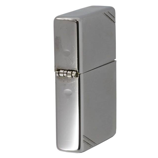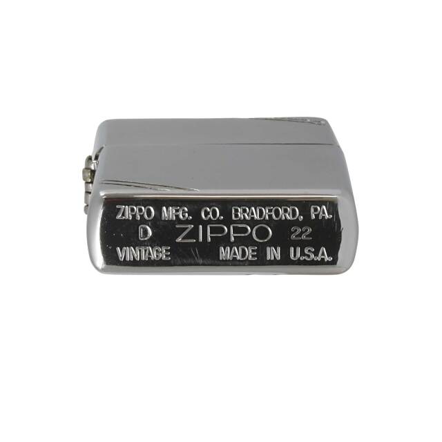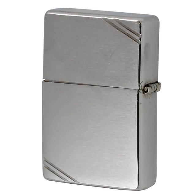 クロムメッキ、ブラッシュド加工。別名1937レプリカとも呼ばれるフラットトップヴィンテージZIPPOです。デザインに落ち着きを与えてくれるダイアゴナルライン(ケース角の2本線)は、ZIPPO社創業当初のデザインです。使用感少なく見た目にはきれいですが、若干ヒンジがゆるいです。蓋の閉まりが悪く、少し開いてしまっています。
