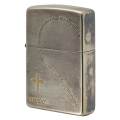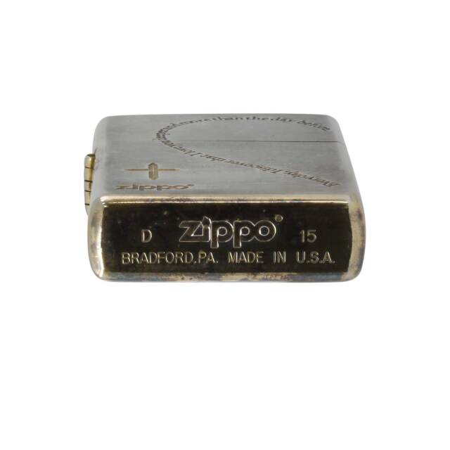 おそらくペアZIPPOの片方です。英語の文字でハートを表現。クロスの彫刻。汚れが目立ちますが、よく見ると側面、天面、ボトムは、金メッキ。表面と裏面は、銀サテン加工。