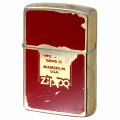 金メッキに赤でZippoロゴなどのデザインがプリントされていますが、表面は剥がれが目立ちます。