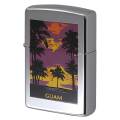 グアムのサンセットがデザインされたZippo。ヤシの木と夕焼けの風景が全面にプリントされています。ハイポリッシュクローム。