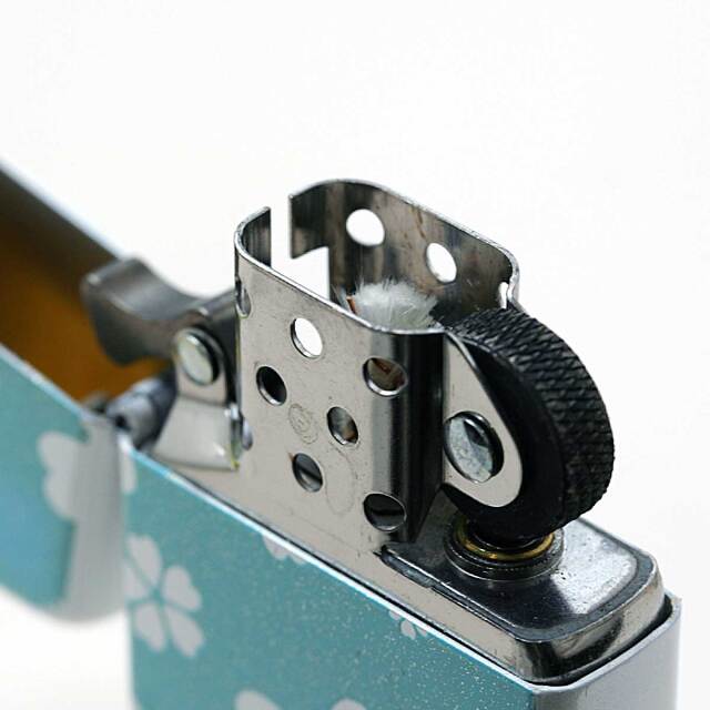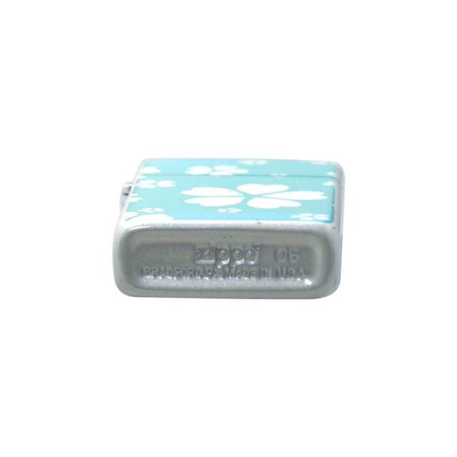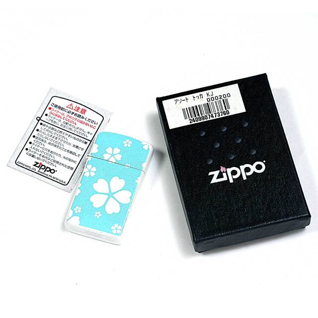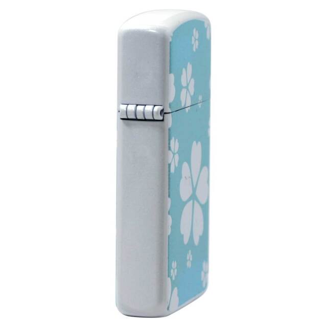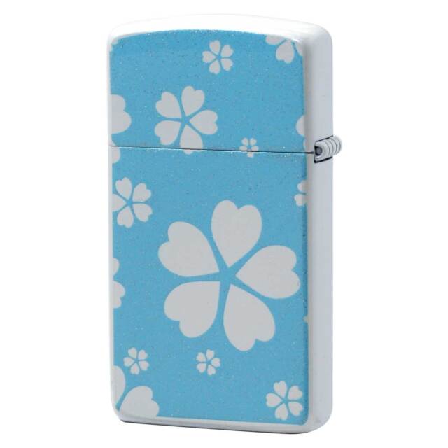 白地に水色の桜模様がデザインされたZIPPO。スリムサイズ。白地部分が桜の花びらになっています。新品未使用品ですが、表面に少し焼けが見られます。パールホワイト塗装。