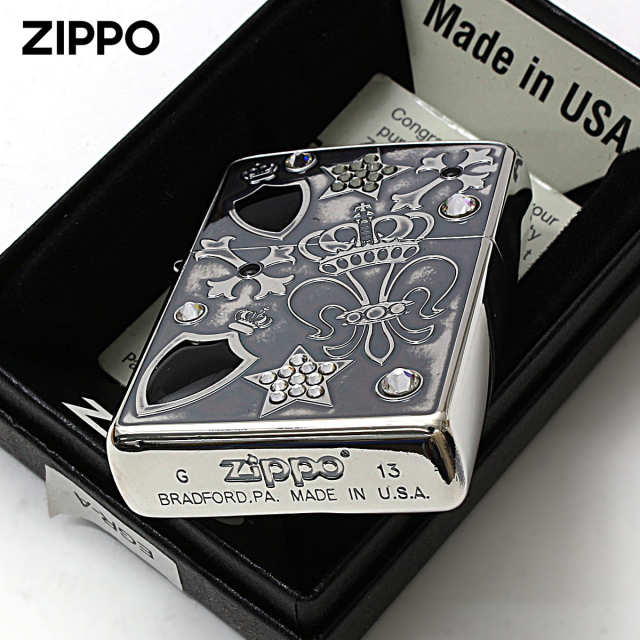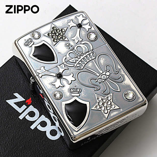 人気のクロス・ユリの紋章・スワロフスキーをちりばめて上品に仕上げZippoです。王冠をかぶったユリとクロスが、どことなく誇らしげ♪独特のイブシ加工をバックに、スターやスワロフスキーが今にも動き出しそうにロックな雰囲気を演出!遊び心をくすぐるデザインです。