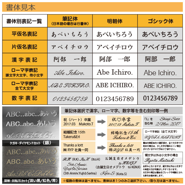 書体は、筆記体・明朝体・ゴシック体の3種類から選べます。アルファベット・数字・漢字・カタカナがご使用頂けます。