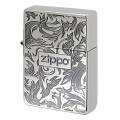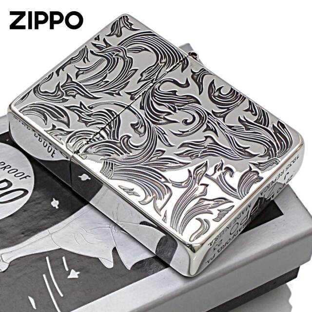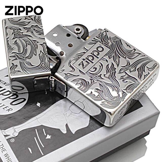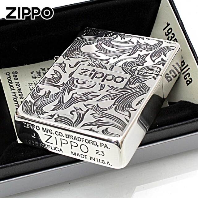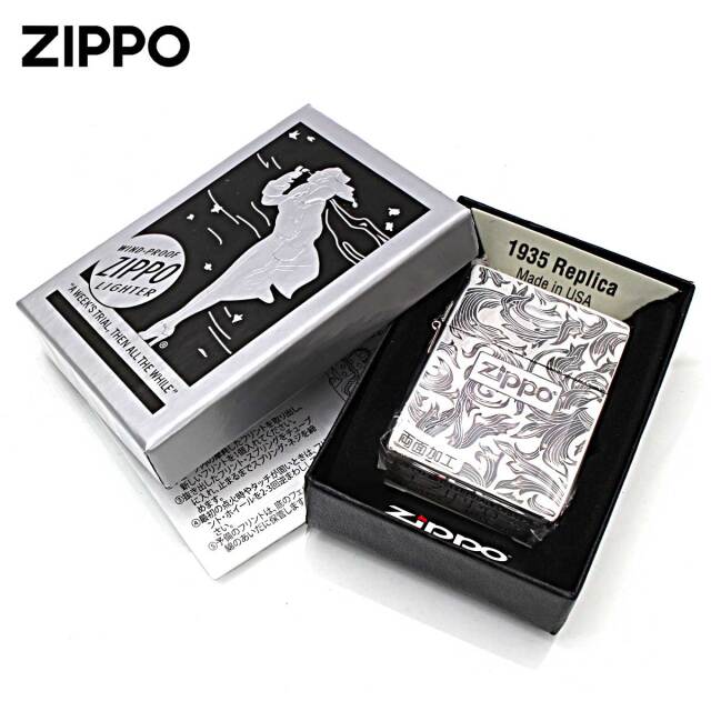 1935年当時の形状を再現した1935レプリカモデルのZippoです。当時の形状の特徴であるブラス材を輪切りにしたようなスクエアケースに、専用のインサイドユニット、ダミーではない本物の3バレル外ヒンジ、フリントホイール部の中空リベット。両面にアラベスク柄を加工、表面の中央にZIPPOロゴが配されております。アラベスク模様とは、アラビア風の植物文様のことで一般的には「ヨーロッパ調の唐草模様」を指します。イブシ加工を施したことで、アンティーク感を醸し出し味わい深い逸品!