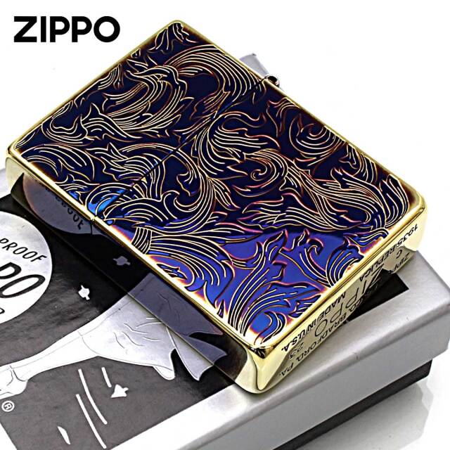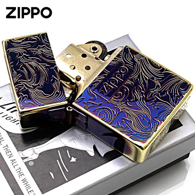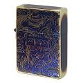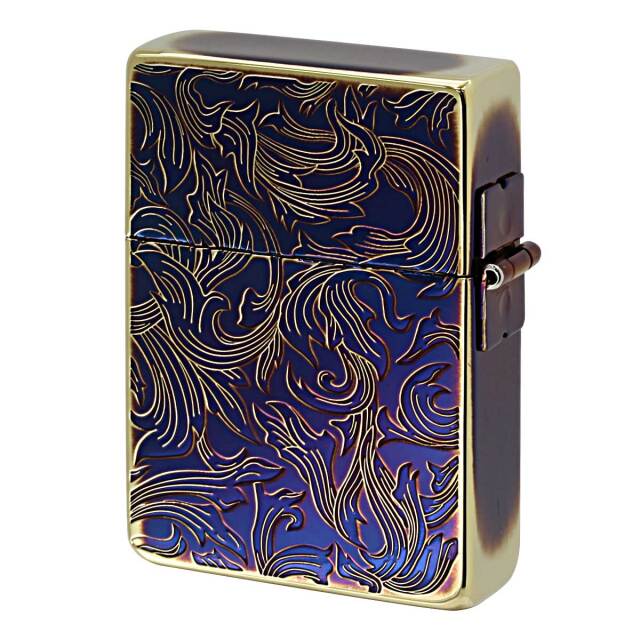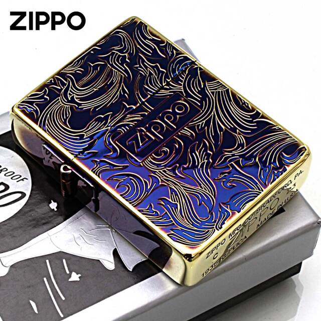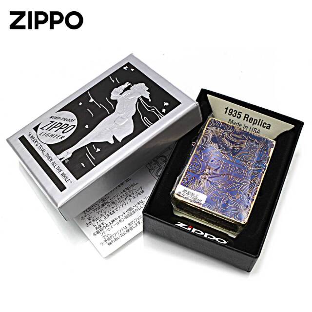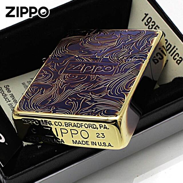 1935年当時の形状を再現した1935レプリカモデルのZippoです。当時の形状の特徴であるブラス材を輪切りにしたようなスクエアケースに、専用のインサイドユニット、ダミーではない本物の3バレル外ヒンジ、フリントホイール部の中空リベット。両面にアラベスク柄を加工、表面の中央にZIPPOロゴが配されております。アラベスク模様とは、アラビア風の植物文様のことで一般的には「ヨーロッパ調の唐草模様」を指します。イブシ加工を施したことで、アンティーク感を醸し出し味わい深い逸品!