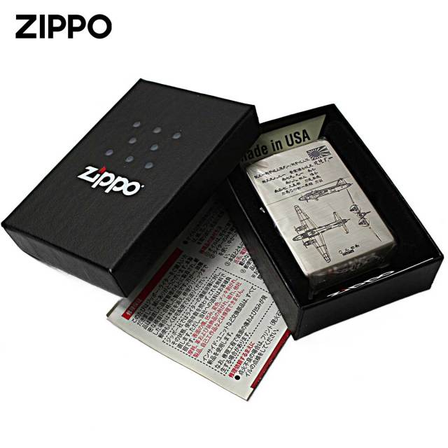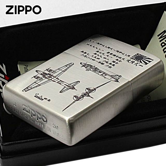 大日本帝国海軍の陸上攻撃機「一式陸上攻撃機」のZippoライターです。略称は一式陸攻。空力的に洗練された、美しい機体の多面図をライター下部に、諸元と旭日旗を蓋部にレイアウト。航続距離に反して防弾性能は弱かったため、アメリカ軍から(火が付きやすいという意味で)「フライング・ジッポー」という渾名が付いていたという話もありますが、