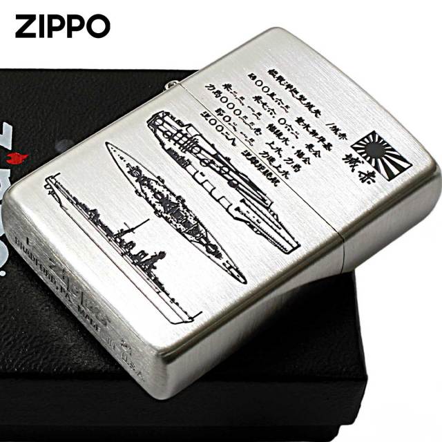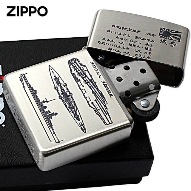 航空母艦「赤城(アカギ)」のZippoです。天城型巡洋戦艦の2番艦として起工されましたが、ワシントン条約により新型戦艦の建造が制限され空母に改造。日本帝国海軍初の大型空母で、連合国が最も恐れた第一航空戦隊の旗艦でした。緒戦の真珠湾攻撃で華々しい戦果を上げ、ラバウル、ポートダーウィン、インド洋を転戦。快進撃を続け、英海軍を撃破するなどの数々の栄光の歴史を持ちます。赤城は巡洋艦から多段空母、一段全通式空母と、改装が繰り返されています。本Zippoに採用した多面図は、本来の巡洋艦のものと、想像上の飛行甲板をモチーフにしたものになっています。赤城は零戦や九七艦攻を艦載し、洋上における機動艦隊の戦いを世界に知らしめました。その活躍から「無敵」とも形容された、歴史に残る名艦です。